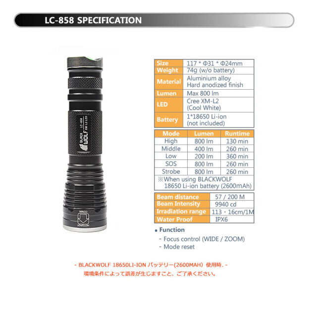 ※ BLACKWOLF 18650リチウムイオン電池使用時