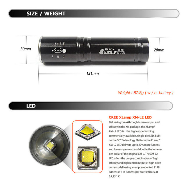 | 製品名: | 【BLACKWOLF(ブラックウルフ)】ハンディライト ズームタイプ LC-858 mini-ZOOM ブラックorグレー Cree XLamp XM-L2 LED(ホワイト/U2)Max800ルーメン |