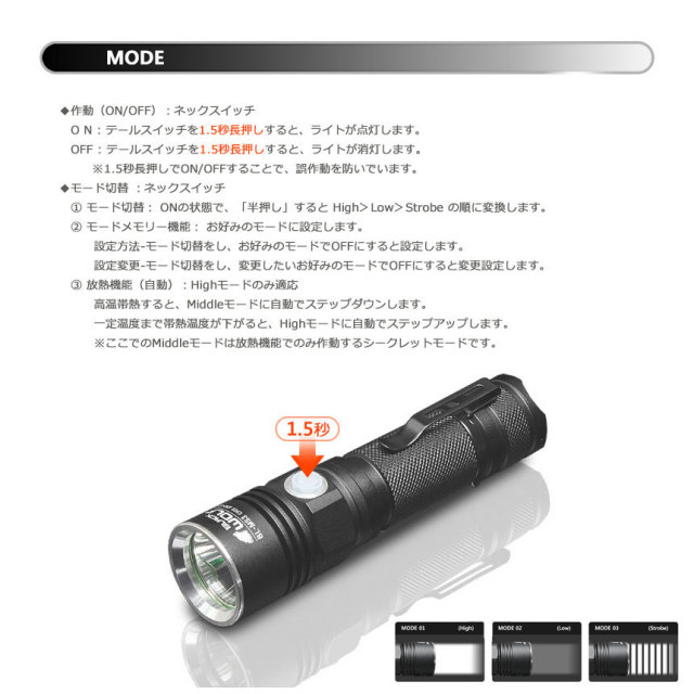1.モード切替:ONの状態で、「半押し」でHigh>Low>Strobeの順に切り替ります。