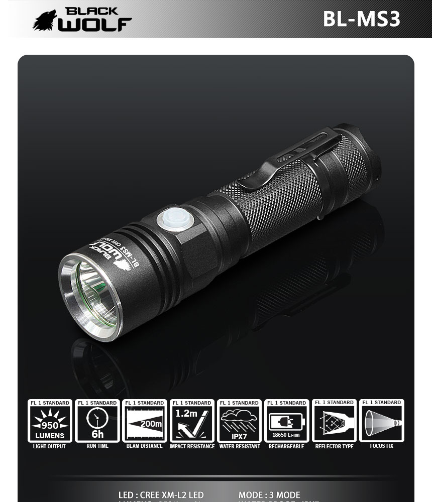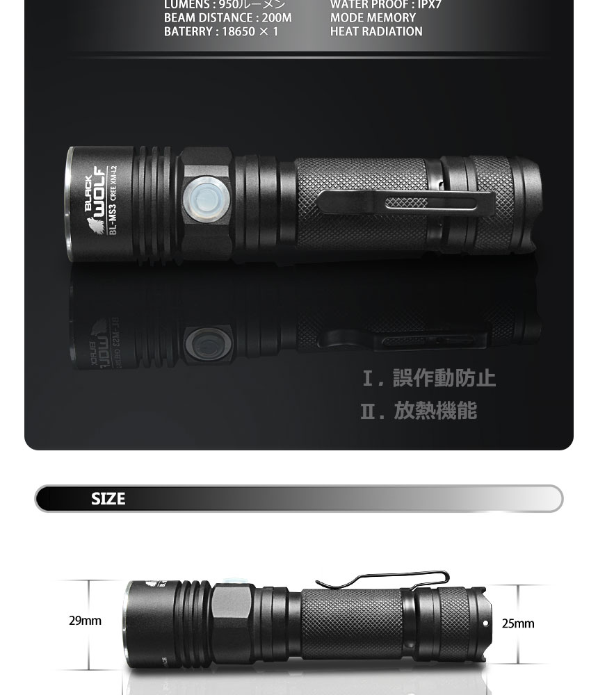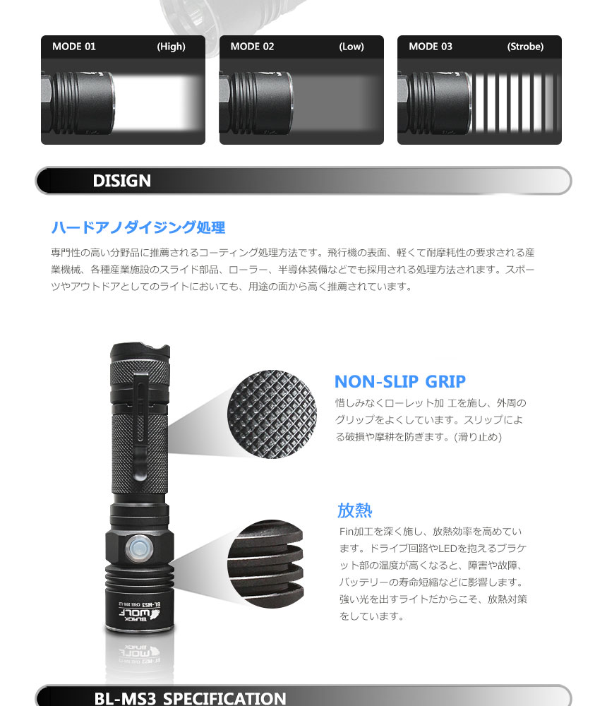 | 製品名: | 【BLACKWOLF(ブラックウルフ)】ハンディライト BL-MS3 XM-L2 Max950ルーメン/メモリー機能 自動放熱 |