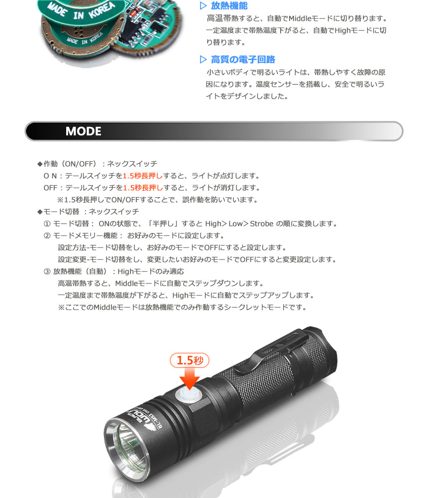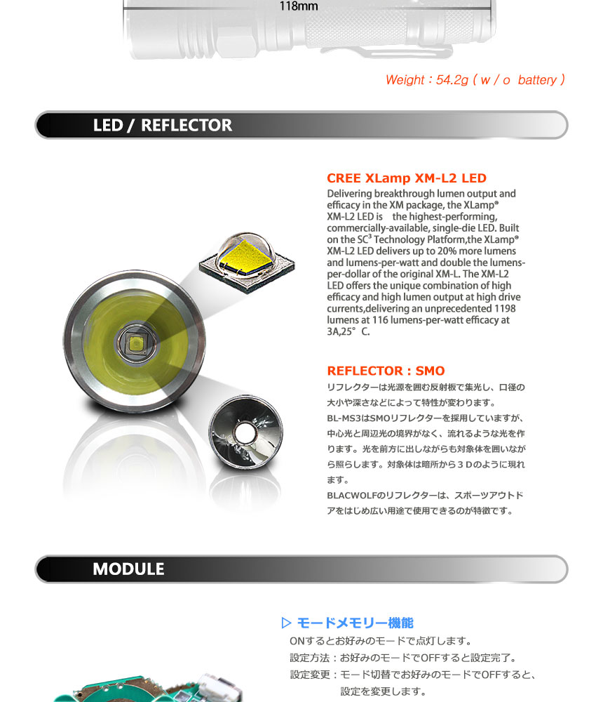 CREE XLamp XM-L2を搭載し、950ルーメンを放ちます。SMOリフですが中心光と周辺光がバランスよくクリアに流れます。相対速度と相対距離がある場合も追える光です。メモリー機能や自動放熱機能などのパフォーマンスも併せて、光をお楽しみください。