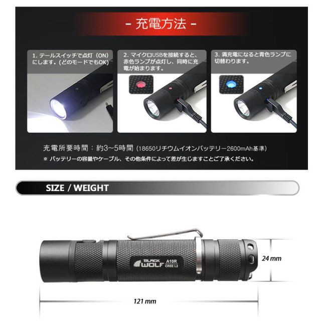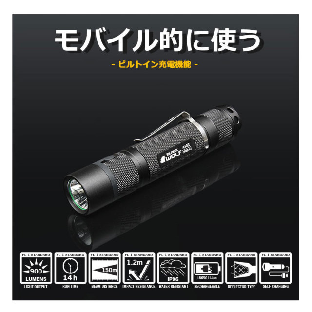 【ランタイム】 MAX14h (BLACKWOLF18650リチウムイオン電池2600mAh使用時)