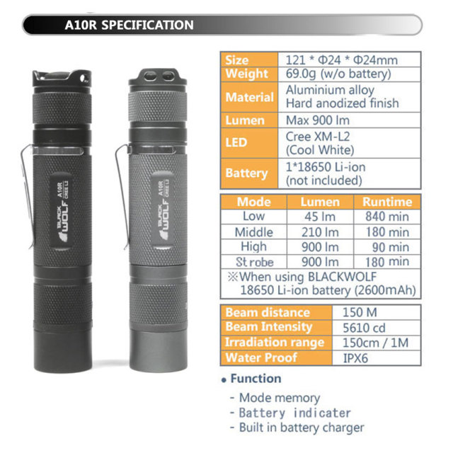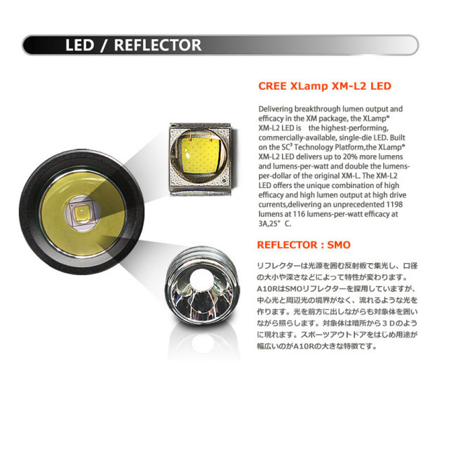 | 製品名: | 【BLACKWOLF(ブラックウルフ)】ハンディライト A10R [リフレクタータイプ・SMO] Cree XLamp XM-L2 LED(ホワイト/U2)Max900ルーメン/本体充電 |