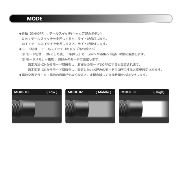 【機能】 モード切替、モードメモリー、充電機能ビルトイン、電池交換アラーム