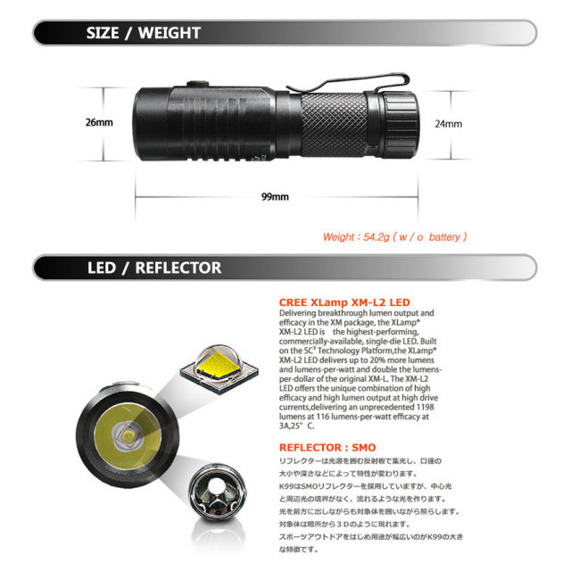 CREE XLamp XM-L2を搭載し、700ルーメンを放ちます。中心光と周辺光がバランスよく流れます。相対速度と相対距離がある場合も追える光です。18650リチウムイオン電池使用で世界最小サイズが特徴です。メモリー機能や自動放熱機などのパフォーマンスも併せて、光をお楽しみください。