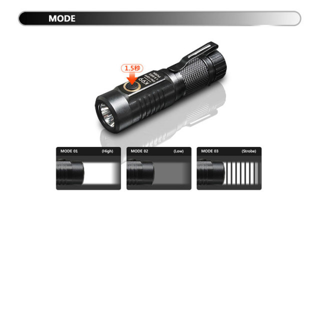 1.モード切替:ONの状態で、「半押し」すると、High>Low>SOSの順に切り替ります。