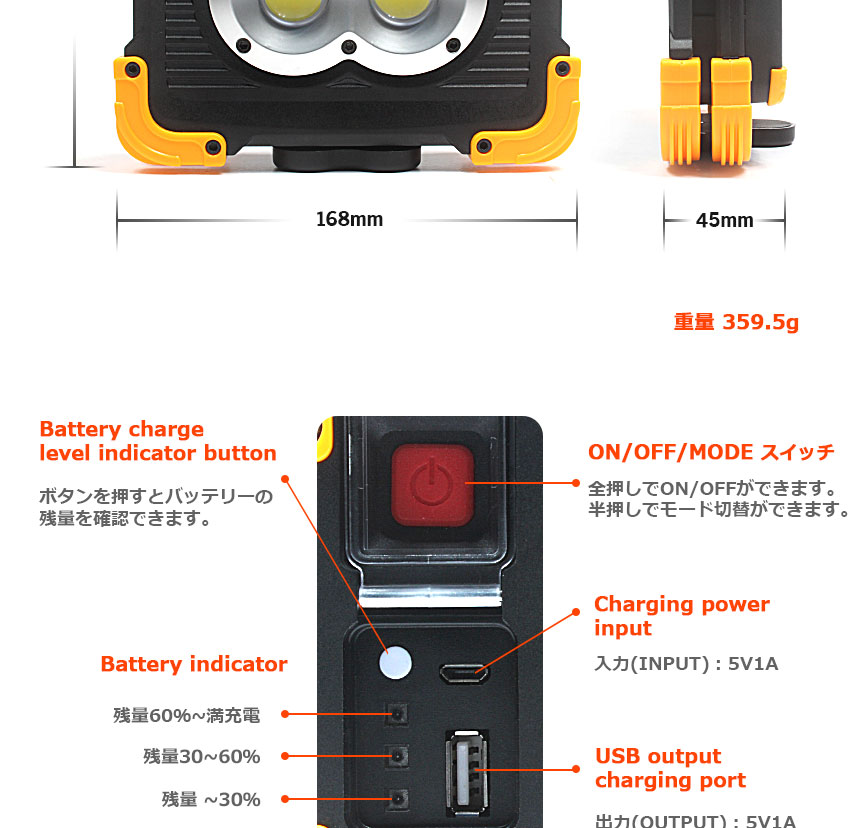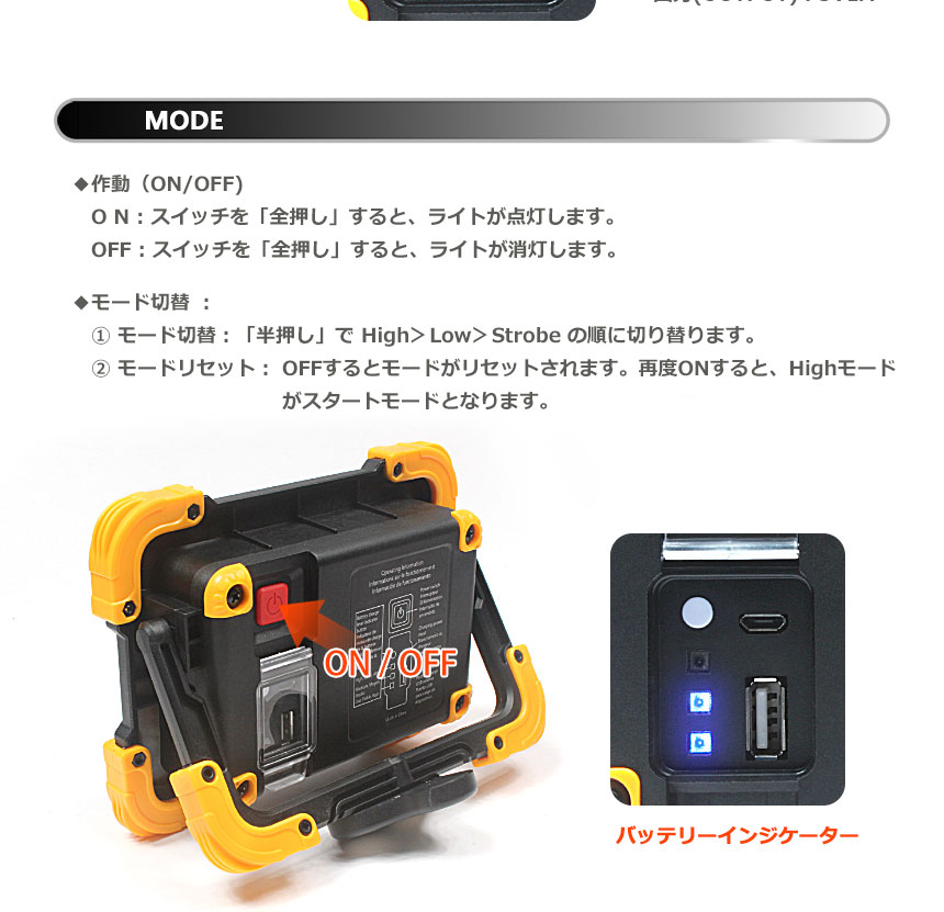 【機能】モード切替、モードリセット、充電機能ビルトイン、モバイルバッテリー、