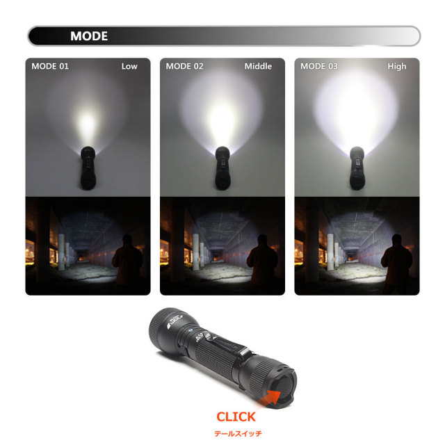 1.モード切替:「半押し」すると、Low>Middle>Highの順に切り替ります。
