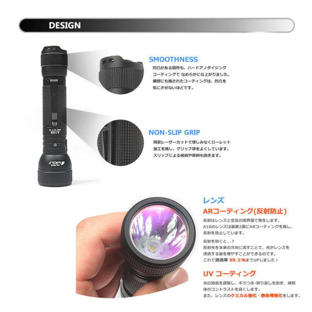 | 製品名: | 【BLACKWOLF(ブラックウルフ)】ハンディライト A16R [リフレクタータイプ・SMO] A16R Cree(クリー)XLamp XP-L HD LED(ホワイト)Max1100ルーメン |