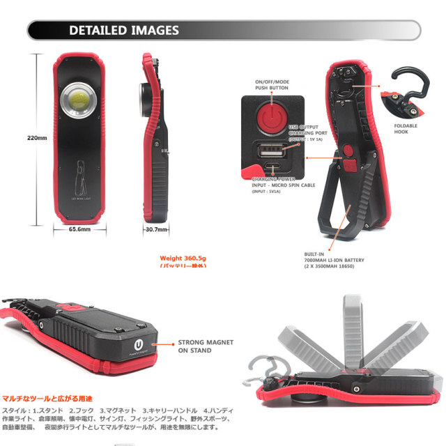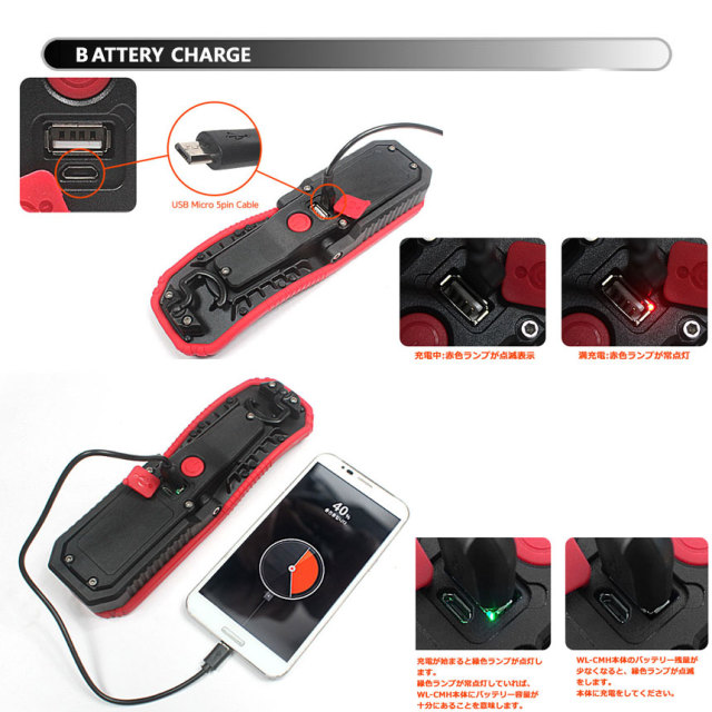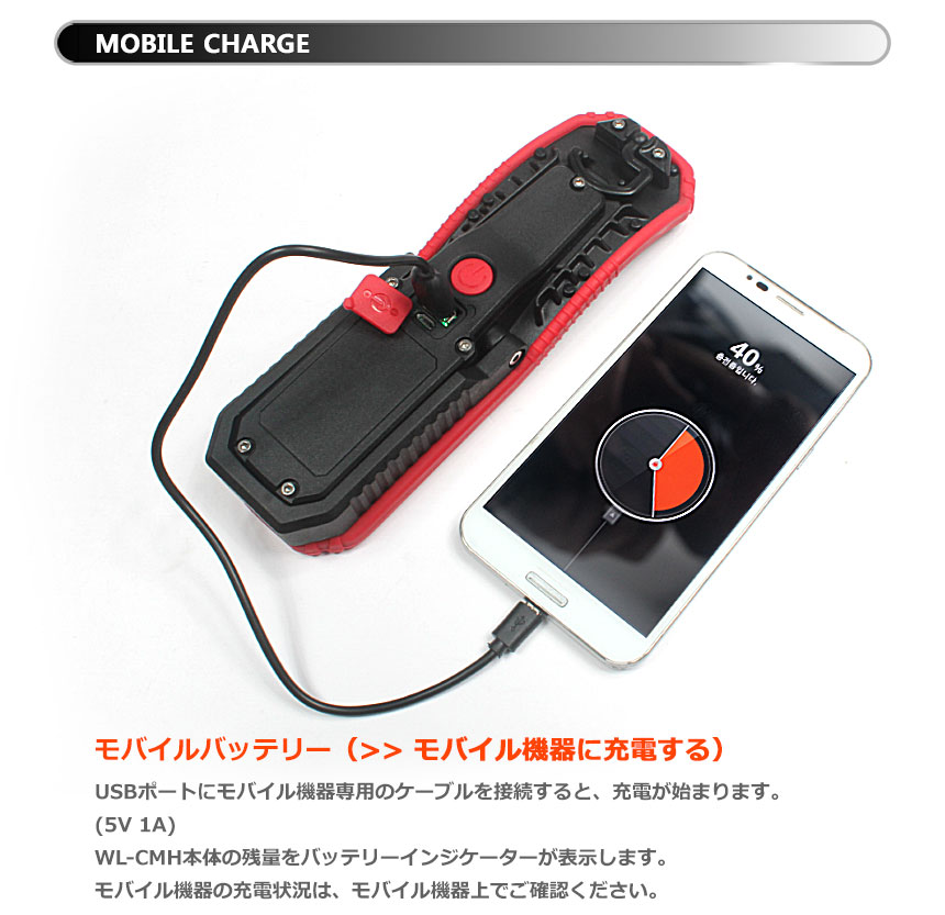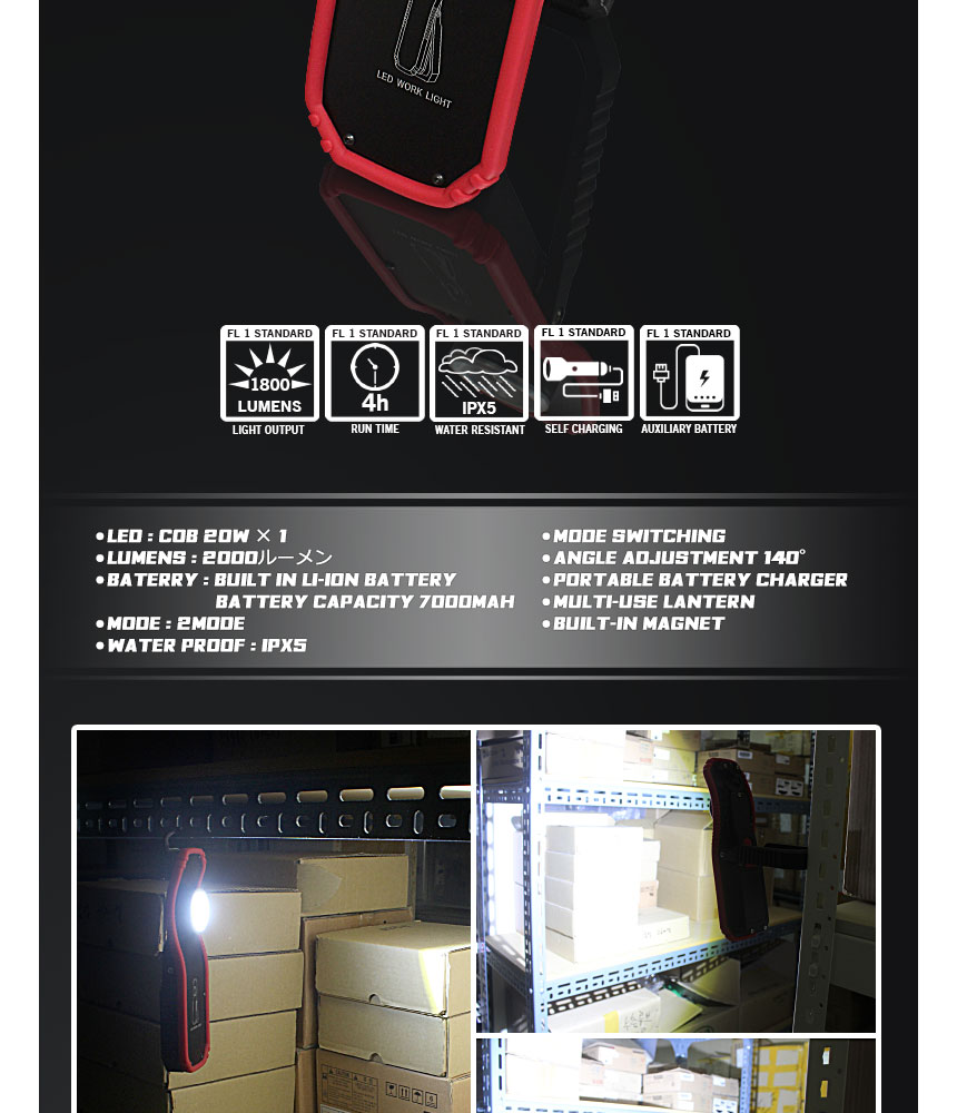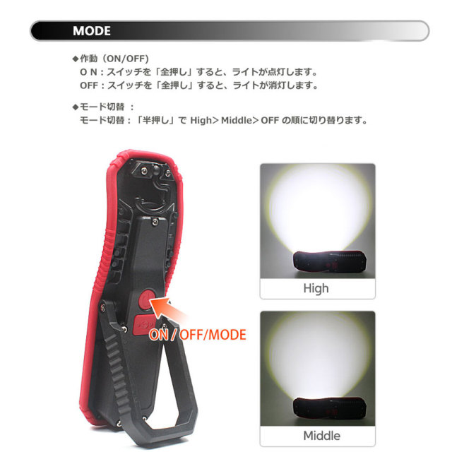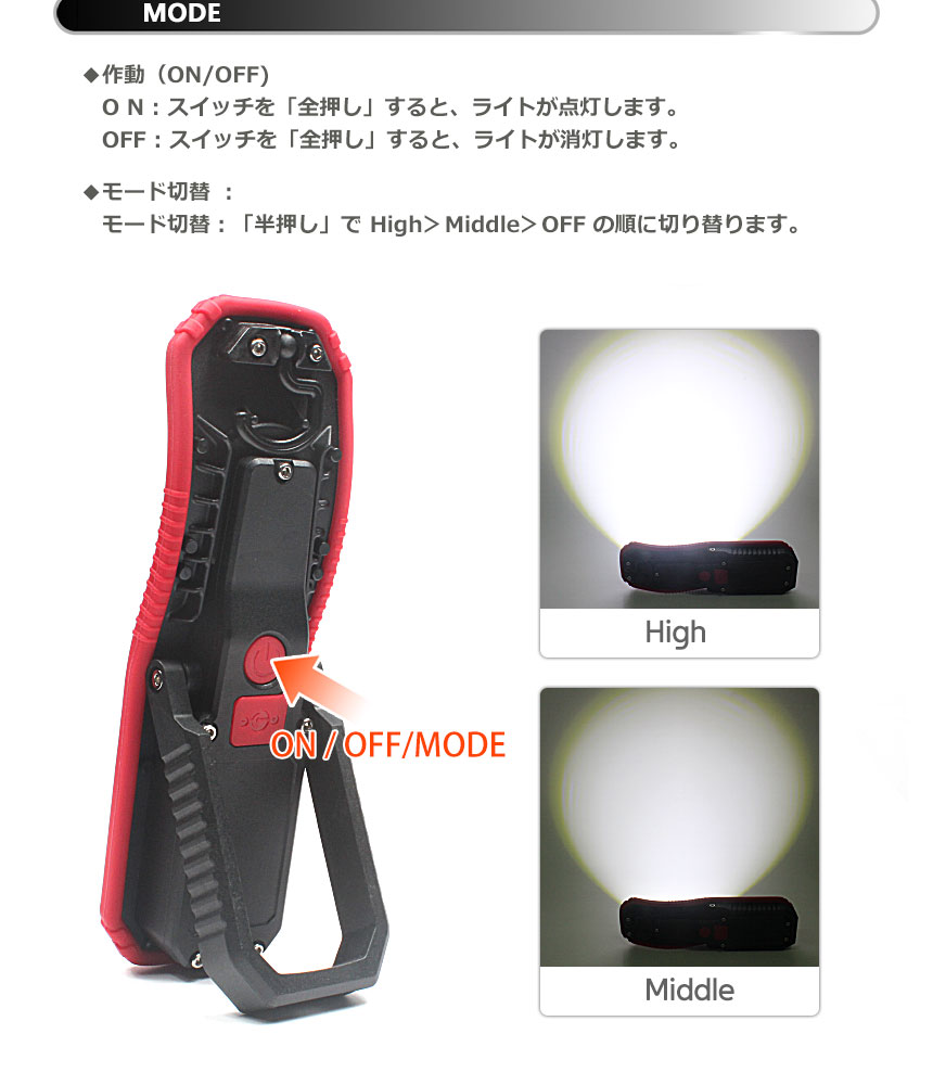 【機能】モード切替、モードリセット、充電機能ビルトイン、モバイルバッテリー機能搭載、キャリアハンドル、マグネット(取付外し)