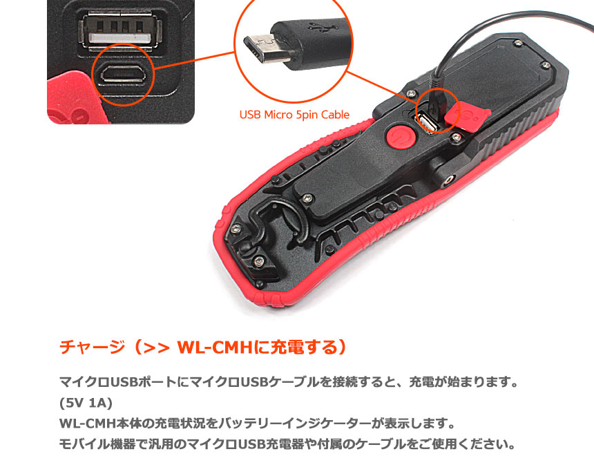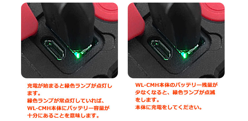 充電中:緑色ランプ点灯 WL-CMH本体の残量が少ない:緑色ランプ点滅