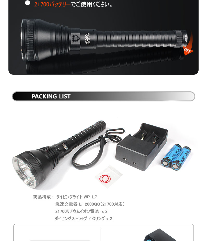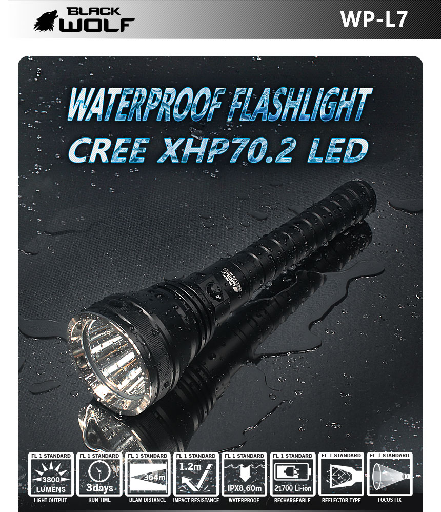 | 製品名: | 【BLACKWOLF(ブラックウルフ)】WP-L7 ダイビングライトIPX8 CreeXLamp XHP70.2 LED Max3800ルーメン |