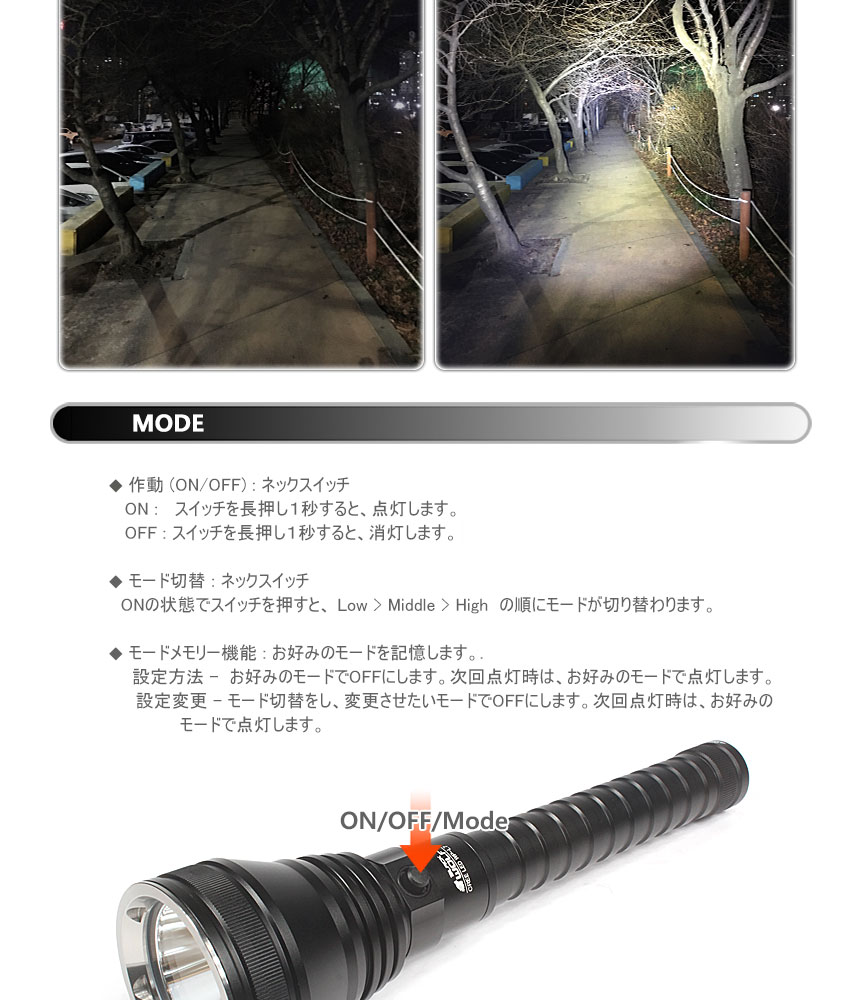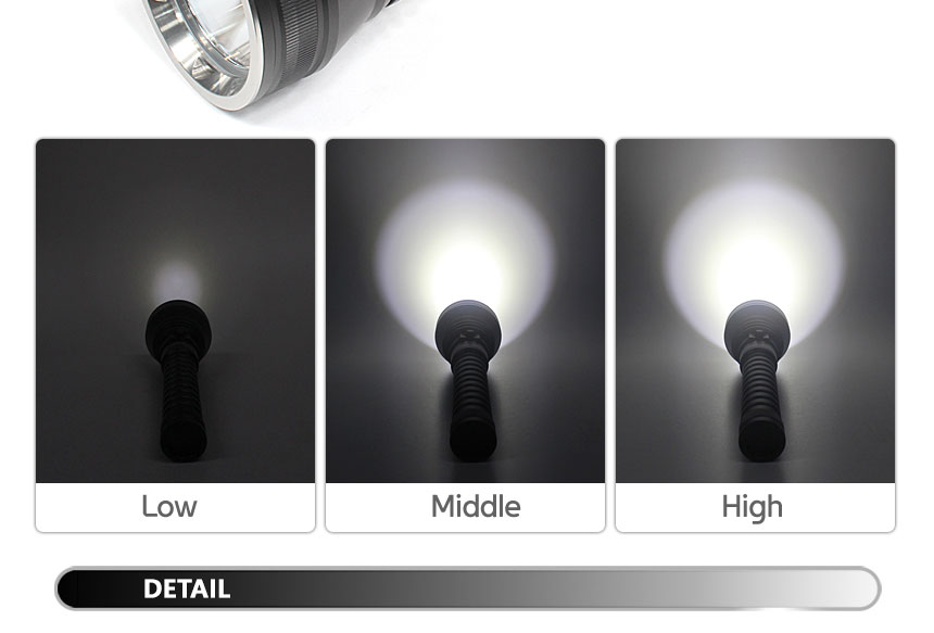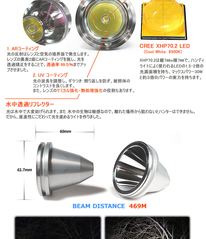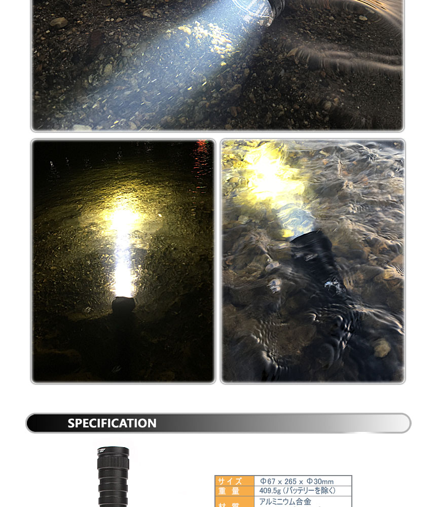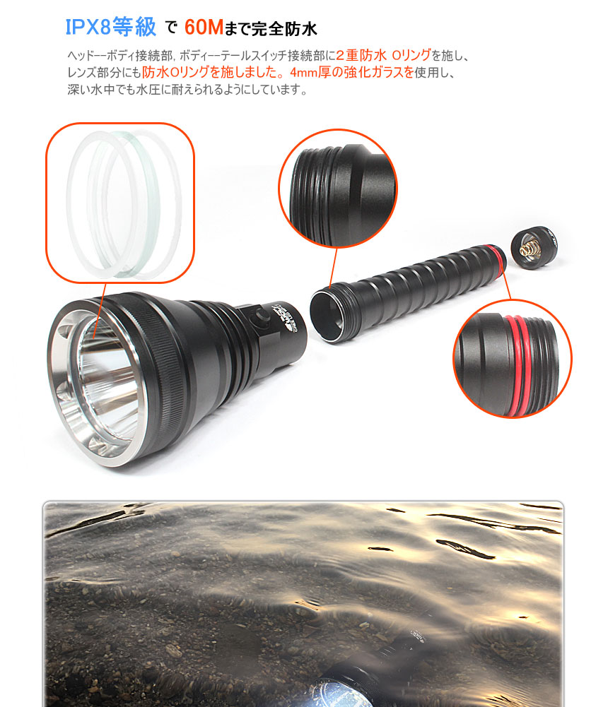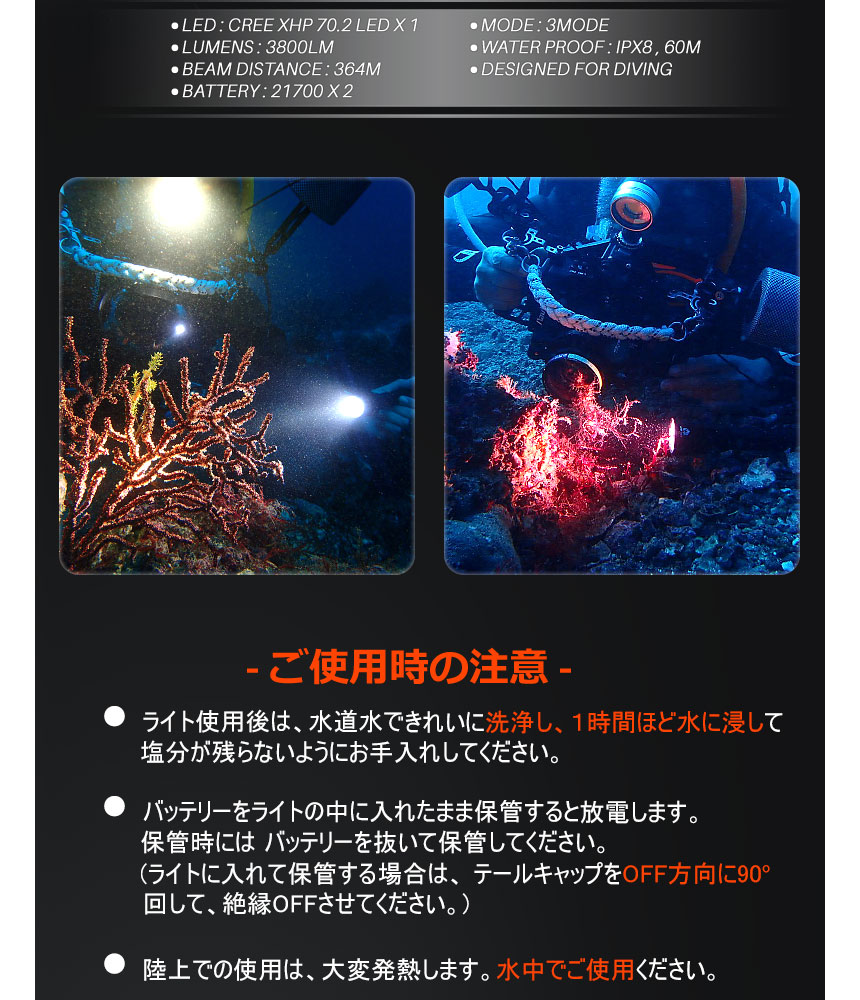 CREE XLampのXHP70.2LEDを搭載し、3800ルーメンを放ちます。大きなLEDが直進性ある強い光を作ります。スキューバダイビング、シュノーケーリングなどマリンスポーツにもお使いください。防水だけでなく、海水に強い部品を厳選・構成しています。機能のパフォーマンスも併せて、光をお楽しみください。