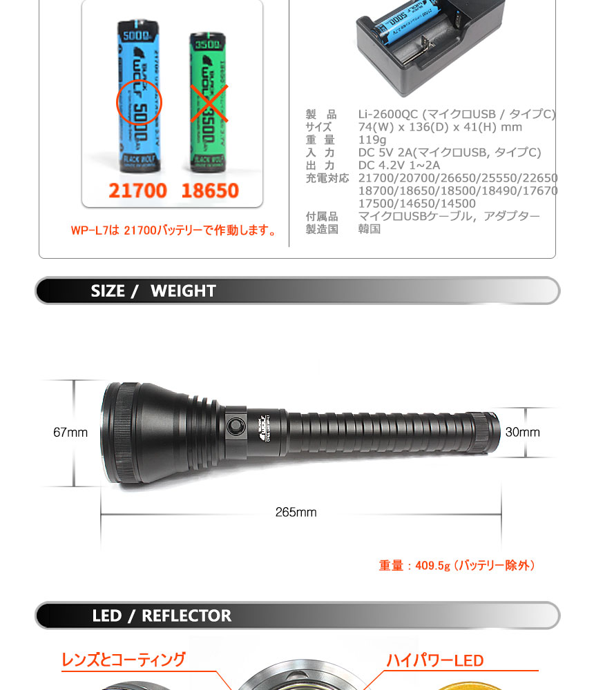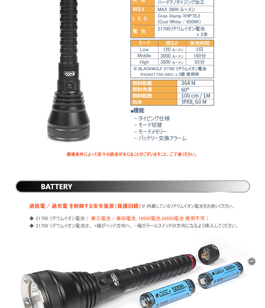 【ランタイム】 MAX75min (Highモード/BLACKWOLF21700リチウムイオン電池5000mAh使用時)